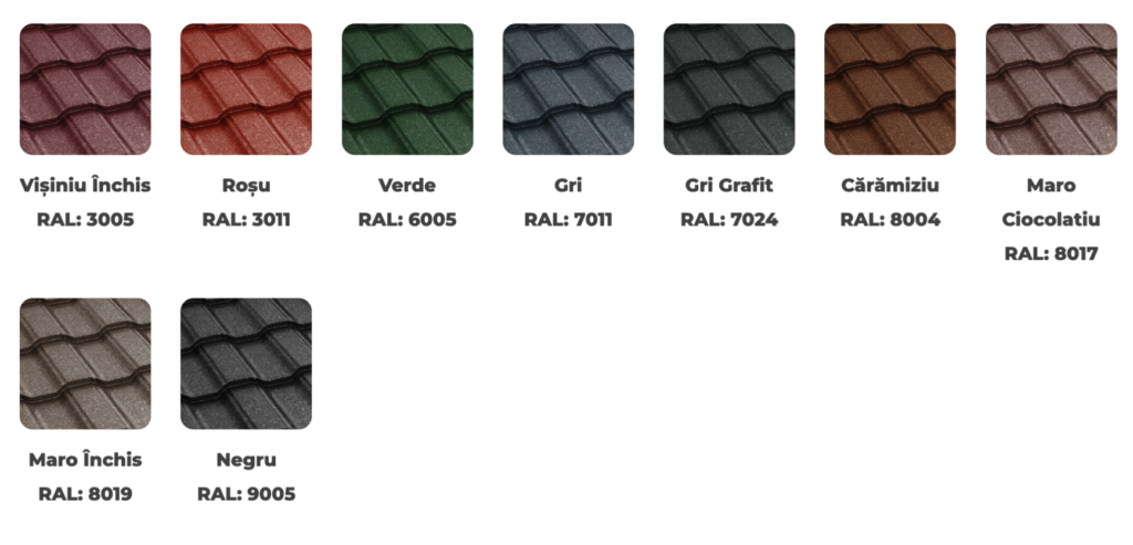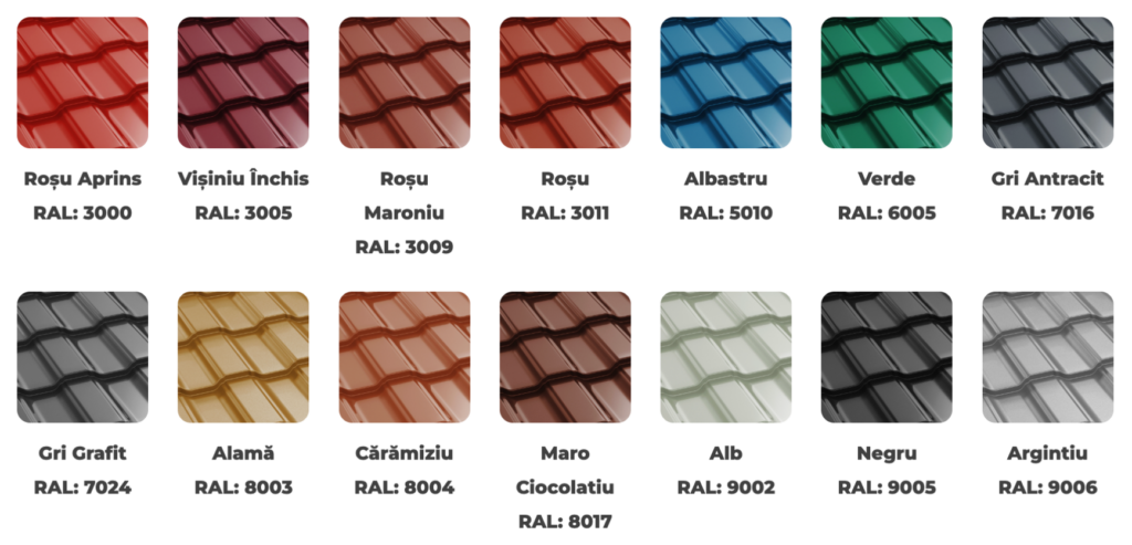 Se poate opta pentru un acoperiș din țiglă metalică, ȋn culori şi nuanțe clasice sau moderne cu trei variante de acoperire finală, cu strat lucios, mat şi grande mat.
