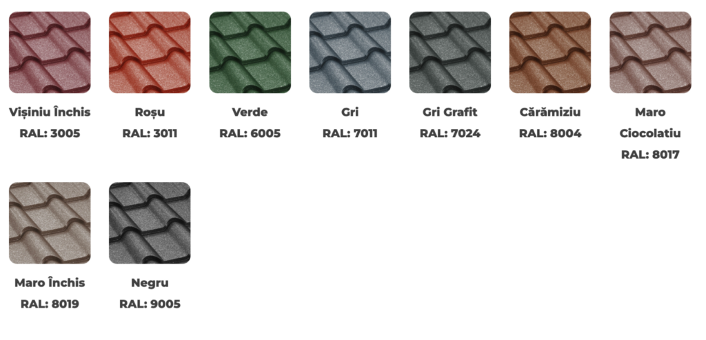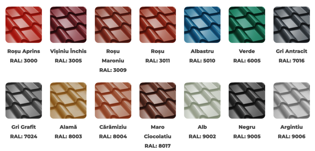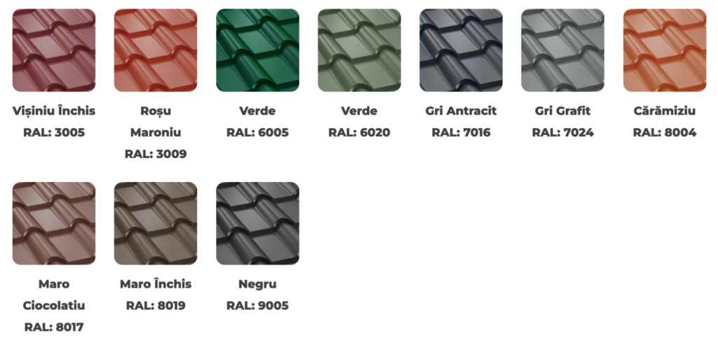 Se poate opta pentru un acoperiș din țiglă metalică, ȋn culori şi nuanțe clasice sau moderne cu trei variante de acoperire finală, cu strat lucios, mat şi grande mat.
