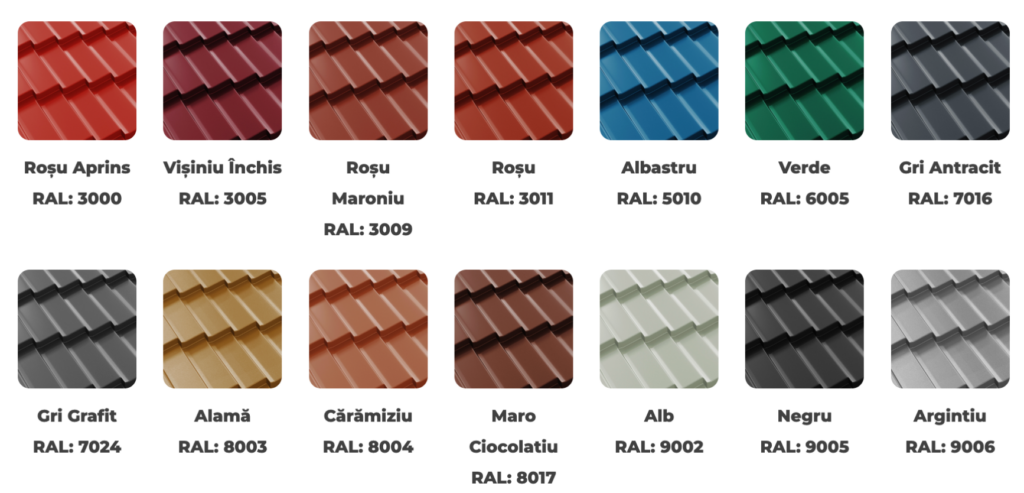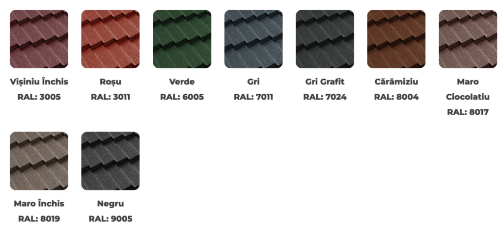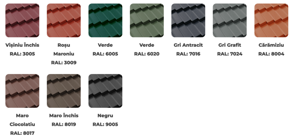 Se poate opta pentru un acoperiș din țiglă metalică, ȋn culori şi nuanțe clasice sau moderne cu trei variante de acoperire finală, cu strat lucios, mat şi grande mat.