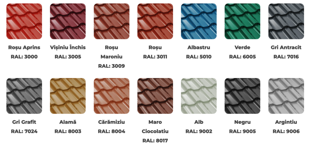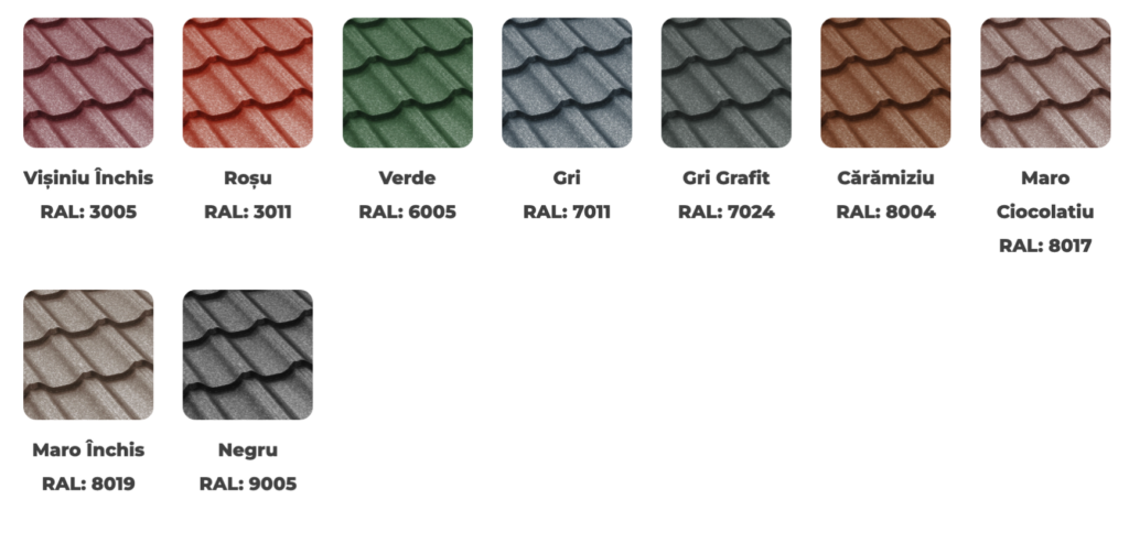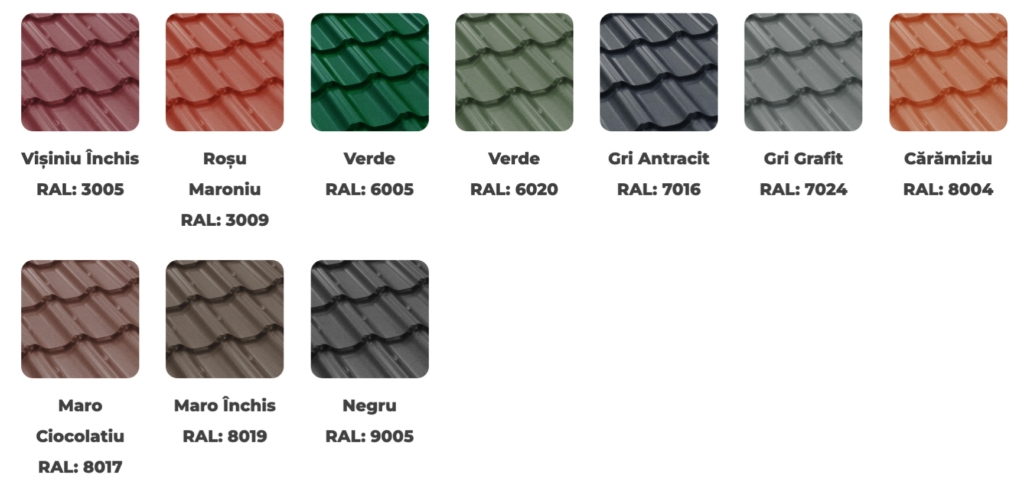 Se poate opta pentru un acoperiș din țiglă metalică, ȋn culori şi nuanțe clasice sau moderne cu trei variante de acoperire finală, cu strat lucios, mat şi grande mat.