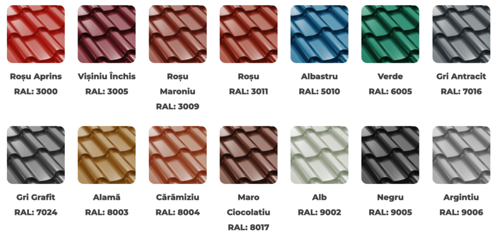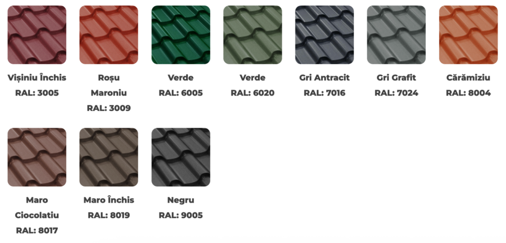 Se poate opta pentru un acoperiș din țiglă metalică, ȋn culori şi nuanțe clasice sau moderne cu trei variante de acoperire finală, cu strat lucios, mat şi grande mat.